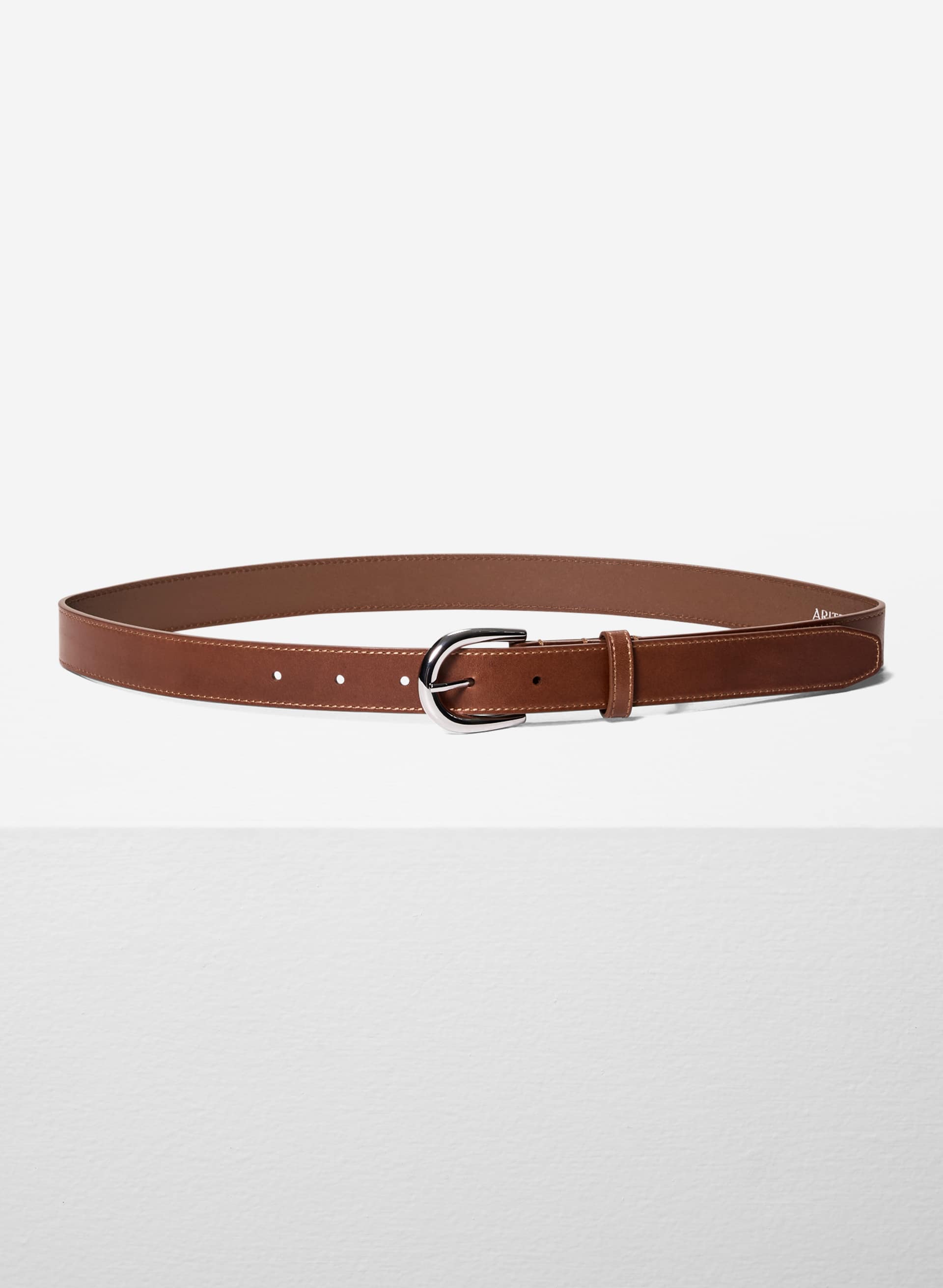 Este é um cinto clássico com uma fivela inspirada no estilo ocidental de latão sólido, bordas pintadas à mão e uma superfície plana para um visual elegante. É feito de couro liso - 100% couro com um acabamento limpo e suave.