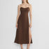 Este é um vestido maxi forrado com decote coração, costas franzidas e fenda na coxa. É feito de linho 100% orgânico respirável com uma textura natural e um toque macio e arejado.